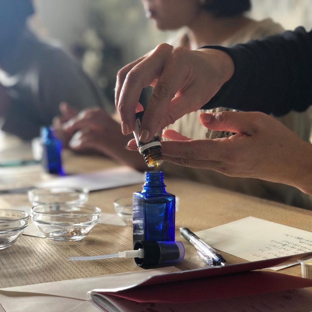 スピリチュアルメッセージに加えて、3種類のオーラスプレー(プロテクション、アファメーション、クリアリング)から選んで自分だけのお守りをつくる手作りアロのワークショップ。